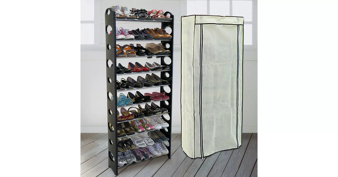 產品說明 《Homelike》簡約二... |  【LIFECODE】可調式十層鞋架(黑色) + 防塵套(米白) 售價:599
